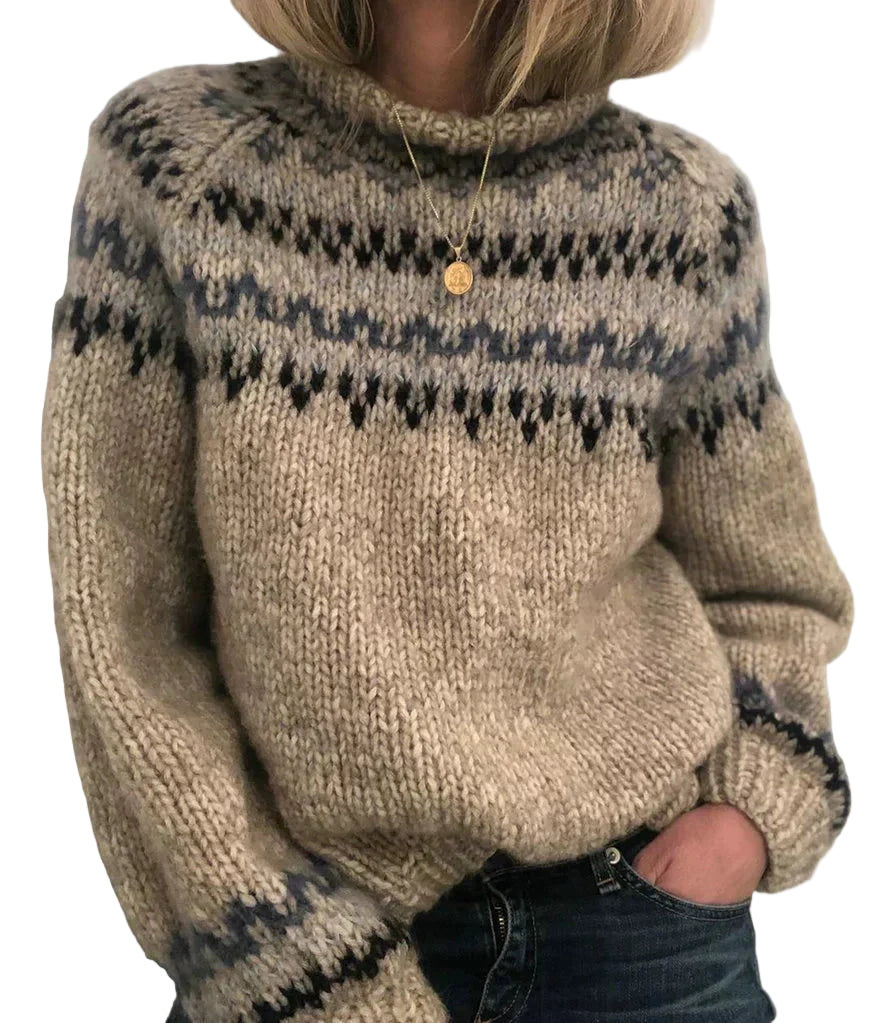 Nordic Warm™ er en striktrøje, der kombinerer en klassisk rund halsudskæring med en høj krave, som giver ekstra varme og et sofistikeret udtryk. Perfekt til både hverdag og særlige lejligheder i de kolde måneder.