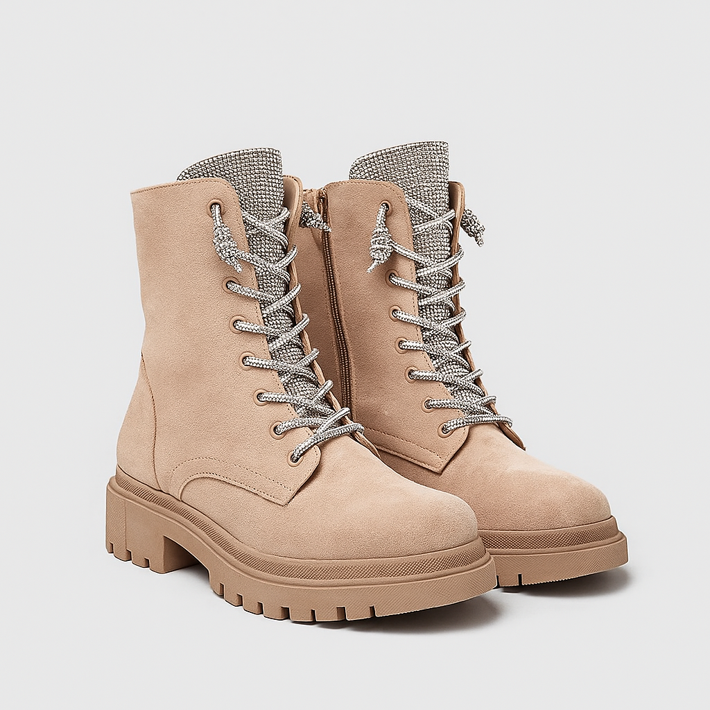 MOIRA™ – BEIGE ANFIBI ANKELSTØVLER MED SNØREBÅND OG JUVELTUNGE